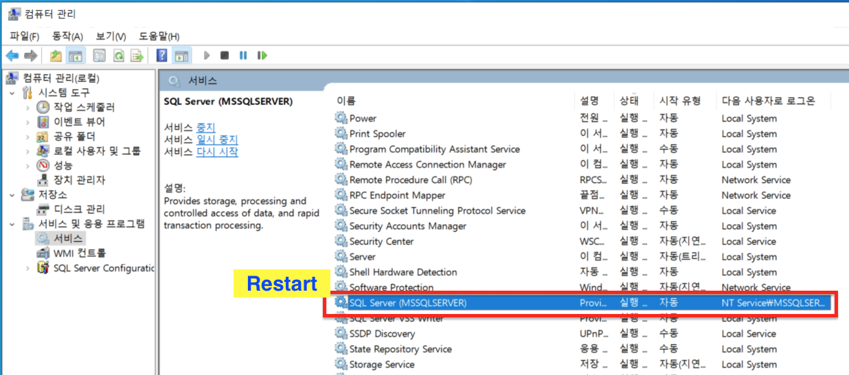 설정을 변경후, SQL Server의 서비스를 재시작 해줘야 합니다.