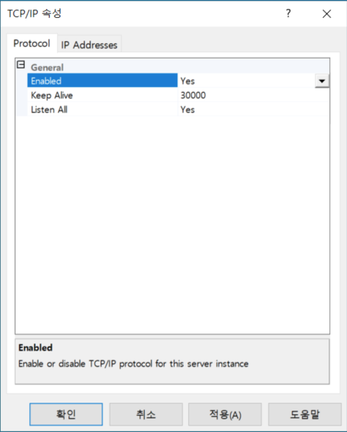 TCP/IP를 활성화(Enabled) 해줘야 합니다.