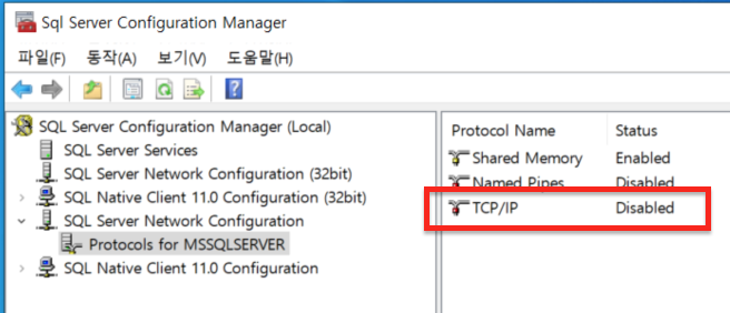 여기서, SQL Server Network Configuration에서 설정을 변경해 줘야 합니다.