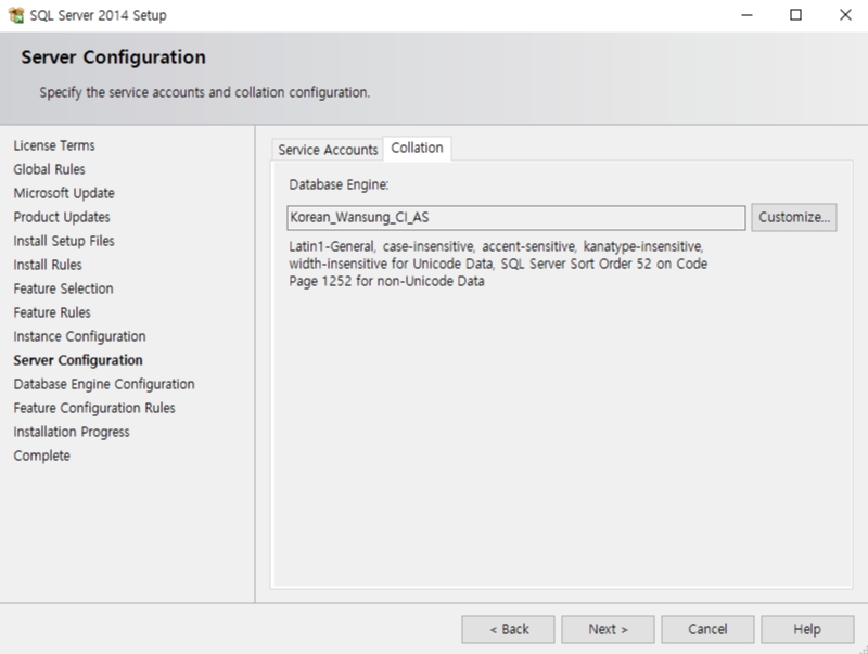 한글 Collation 예: Korean_Wansung_CI_AI 로 변경가능