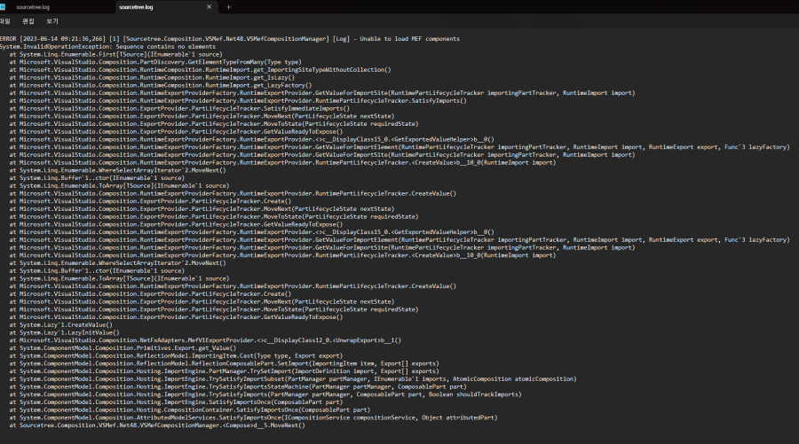 SourceTree에서 "Unable to load MEF components"를 읽어 올 수 없다는 메시지가 뜹니다.