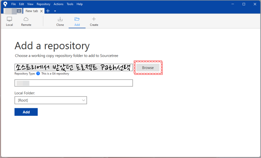 다시 설정값을 가져오기 위해서는, SourceTree의 [ Add ]를 통해서 프로젝트의 설정값들을 다시 불러올 수 있습니다.