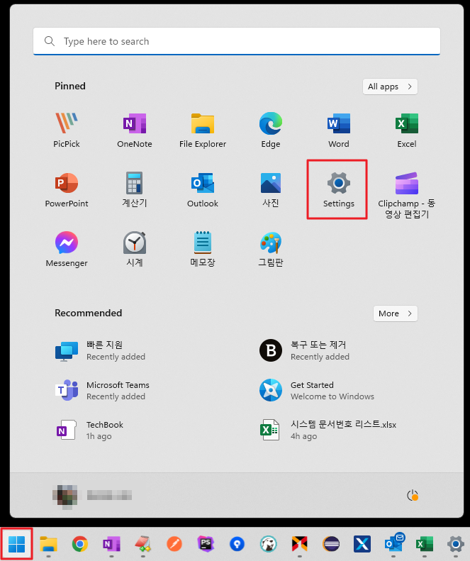 작업 표시줄(Taskbar) 줄에는 위젯(Widgets)과 채팅(Chat)을 발견할 수 있습니다.
