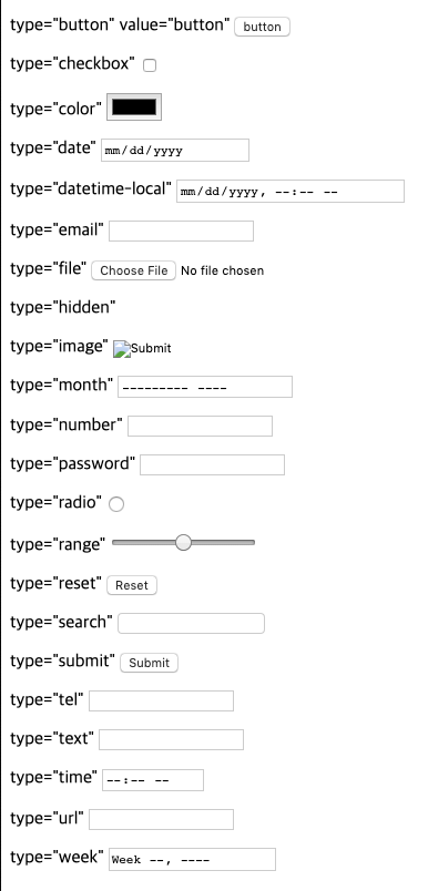 <p>type="button" value="button" <input type="button" value="button"></p>