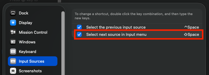 Keyboard에서 Shortcuts > Input Sources에