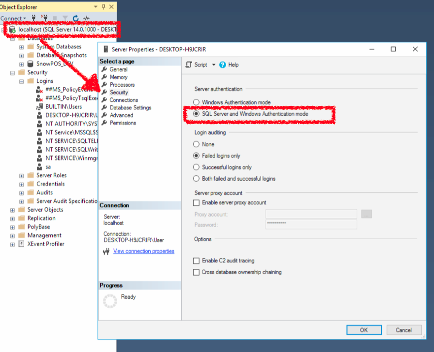 우선, Authentication을 Windows Authentication 으로 변경해서 로그인을 했습니다.